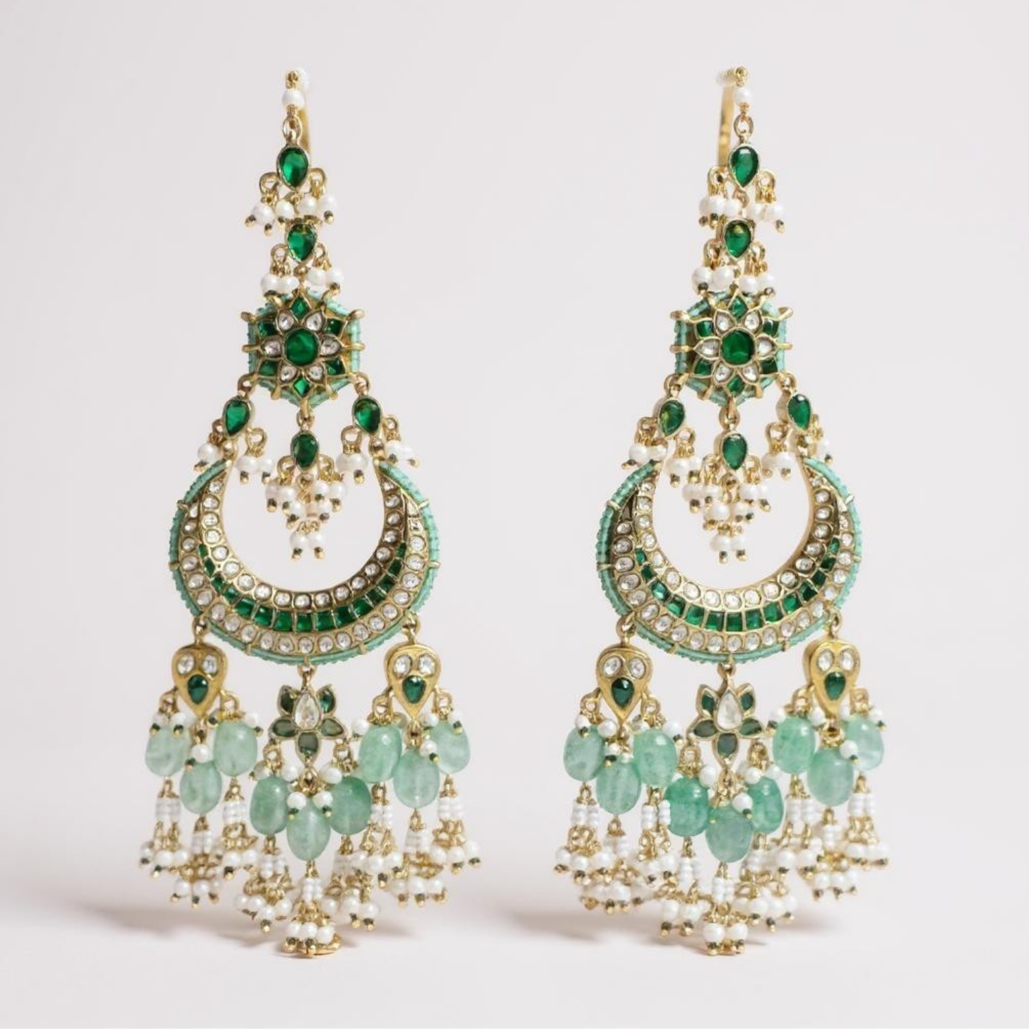 These statement earrings are crafted in high-quality brass, embellished with sparkling pachi kundan stones. The intricate layers of pearls and bead detailing add a dramatic yet graceful finish.