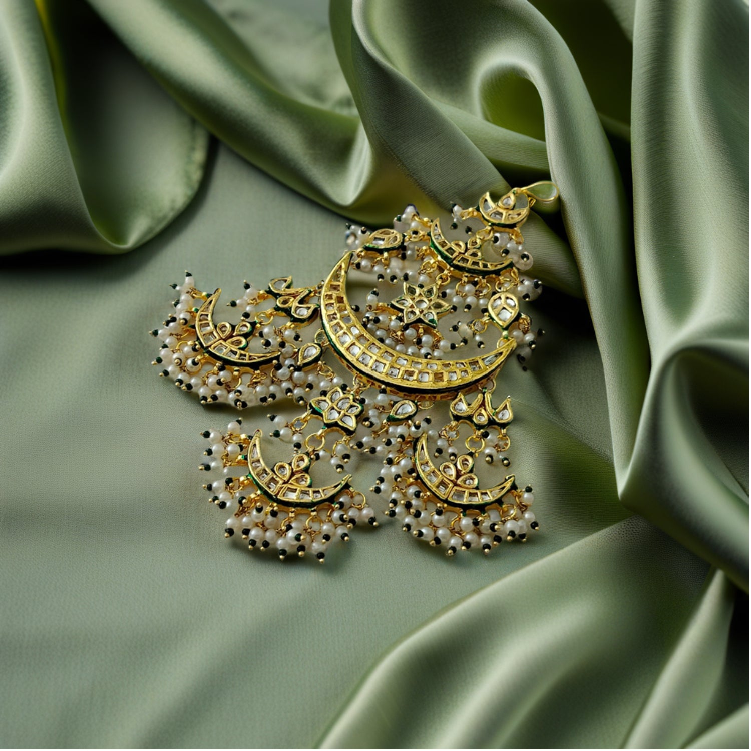 Elevate your traditional look with this exquisite Chand Sitara passa, a blend of regal charm and timeless craftsmanship. Handcrafted in high-quality brass with a luxurious 22K gold-tone polish, this side headpiece features crescent moon and floral motifs embellished with intricate Kundan stones and delicate green enamel accents. The design is enhanced with cascading pearls and black bead droplets, creating a graceful sway with every movement.