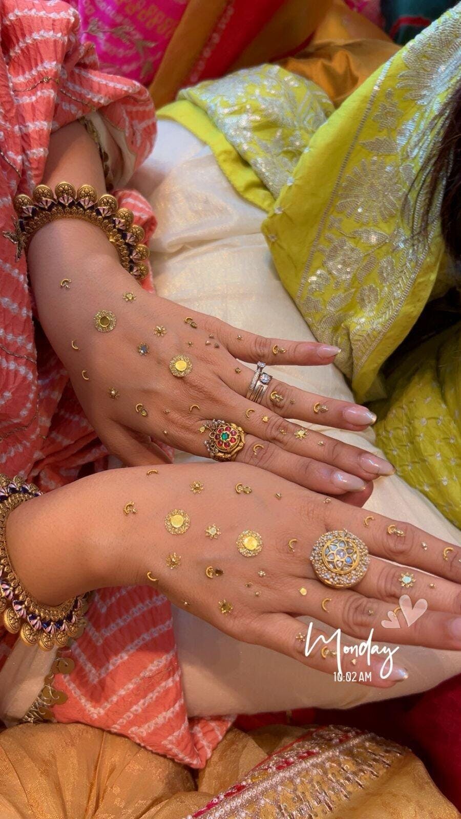 Inspired by mirror motifs and crafted in gold tones, these bindis turn your hands into wearable art.